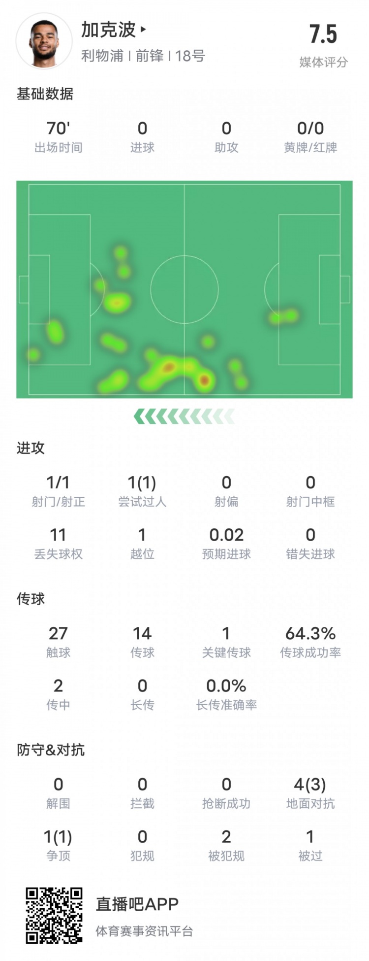 2月2日讯 英超第24轮,利物浦客战伯恩茅斯,加克波首发出战,制造1粒点球,1次过人成功,送出1次关键传球,评分7.5。加克波本场比赛数据:进球0助攻0造点1射门1射正1过人1过人成功1丢失球权11触球27传球14关键传球1传球成功率64.3%传中2地面对抗4地面对抗3争顶1争顶成功1被犯规2被过1 本文标签: 足球 英超 利物浦